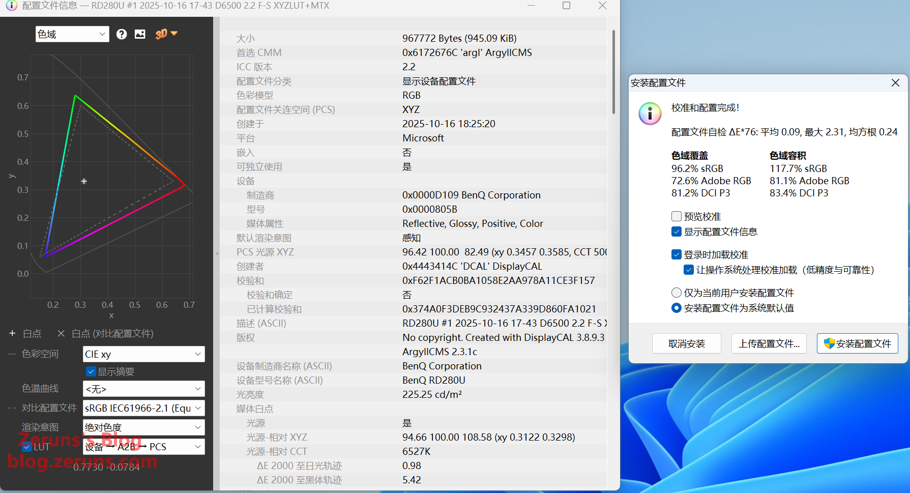 屏幕实测色域色准数据,用Spyder5校色仪测的,sRGB色域覆盖96.2%,色域容积117.7%,平均色差(Average ΔE*00)实测值为2.23,还行,最大偏差(Maximum ΔE*00)实测值为6.26,偏差较大,偏差最大在于蓝色部分,猜测应该是与硬件滤蓝光有关。