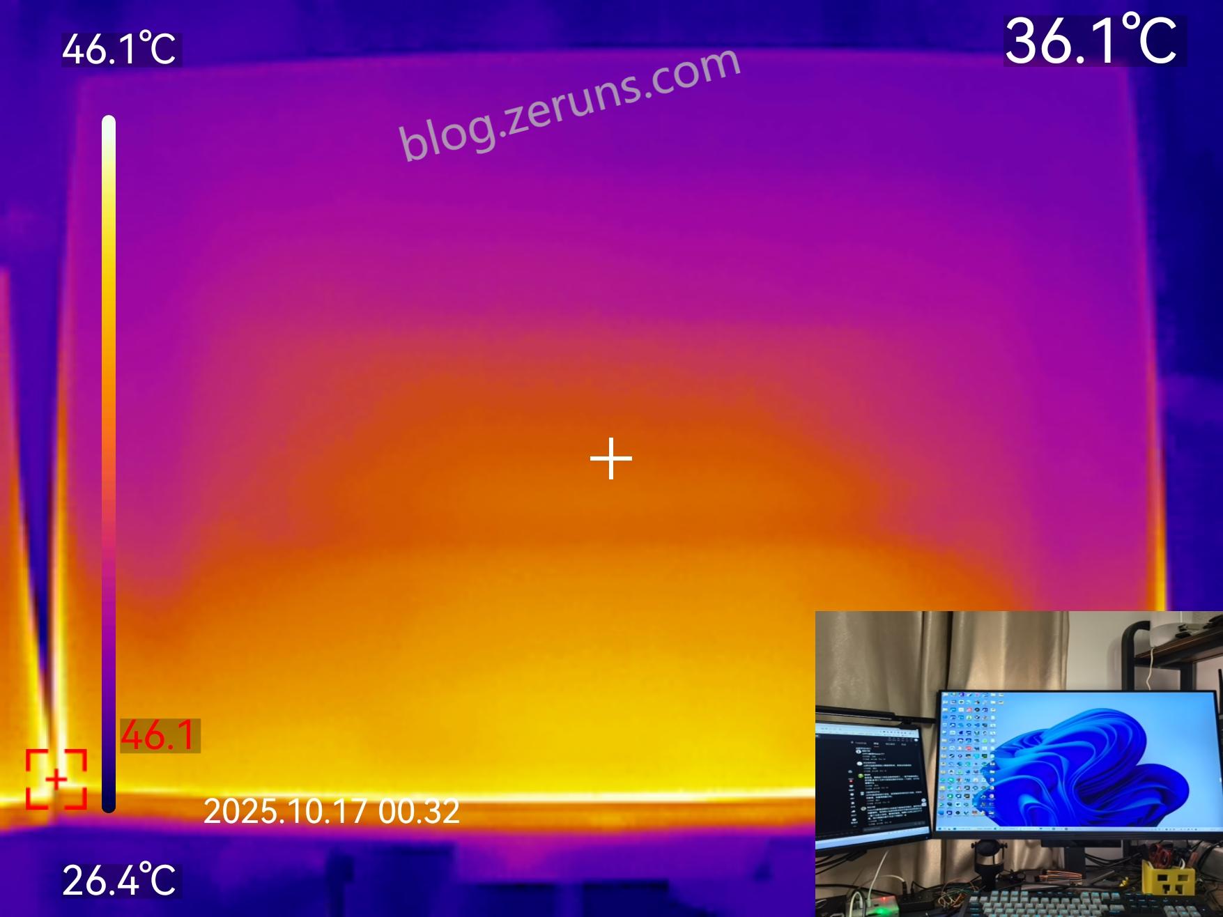 屏幕发热情况热成像图如下图,发热主要集中在屏幕底部,屏幕背光灯应该在底部,最高温度46.1℃(室温26度左右)。