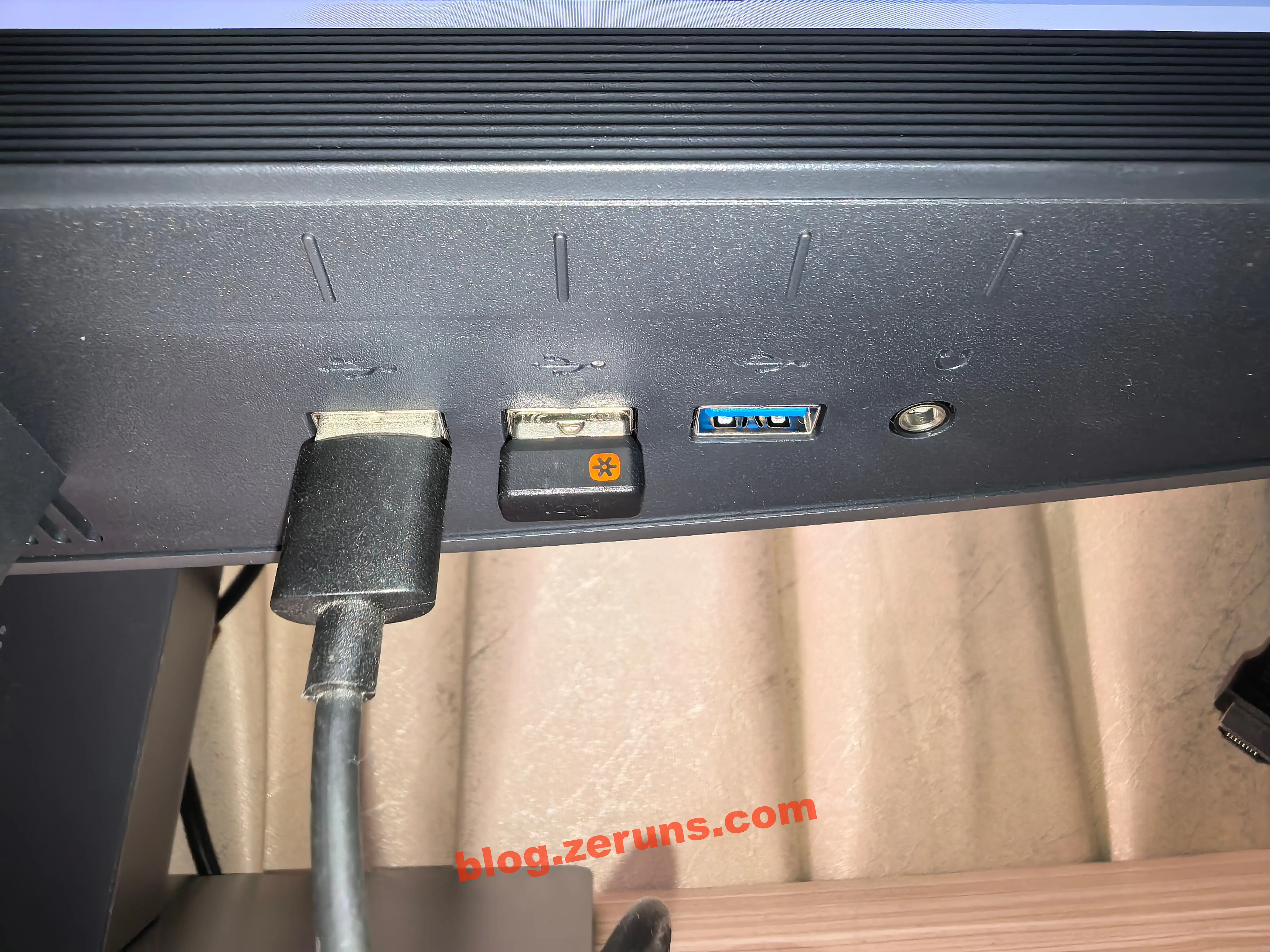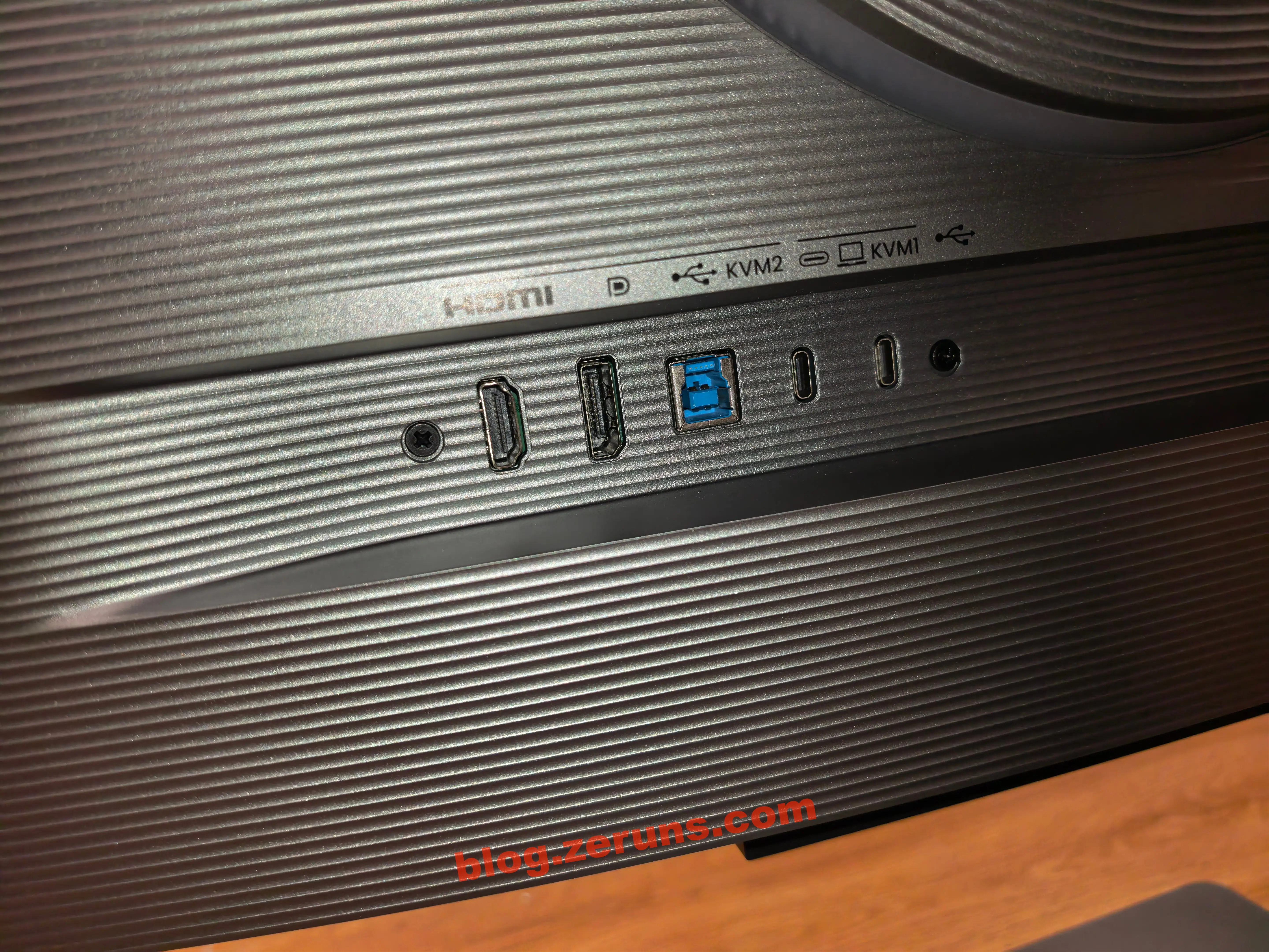 屏幕底部右侧有3个USB-A口和1个3.5mm耳机孔,3个A口都是5Gbps速率的(从背面输入的Type-B后或C口输入拓展出来的,通过切换信号源来切换,以此实现KVM功能,在这插上鼠标键盘即可一套键鼠控制两台电脑)。