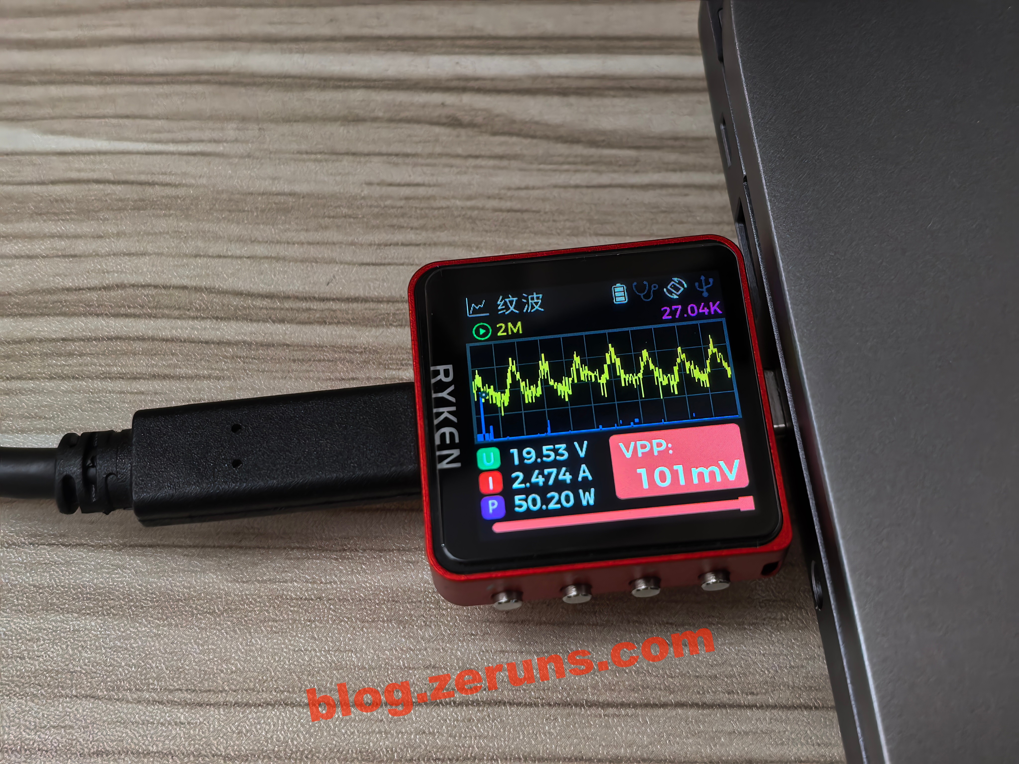 显示器C口输出20V2.4A时的输出电压纹波峰峰值在100mV左右,还行。(正常应该接阻性负载,我直接插笔记本上测了,可能不准)