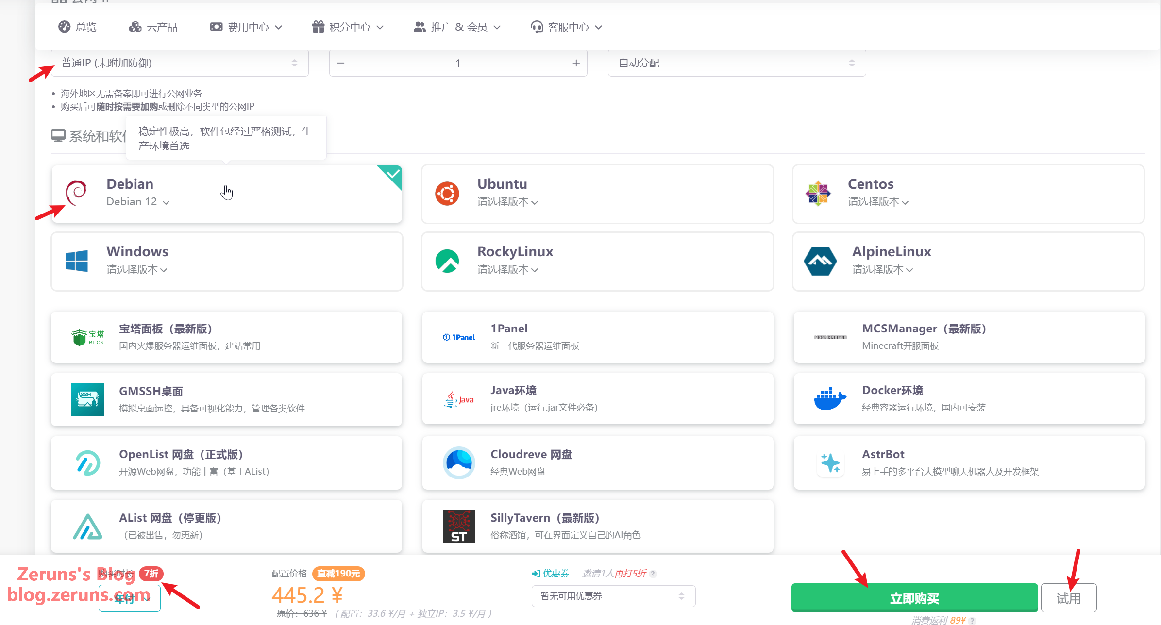 系统选择Debian12,都选好后就可以点击立即购买了,年付有7折优惠(用我优惠码注册的可领取额外的8折券叠加年付7折使用实现5.6折),也可以选择1元试用1天。