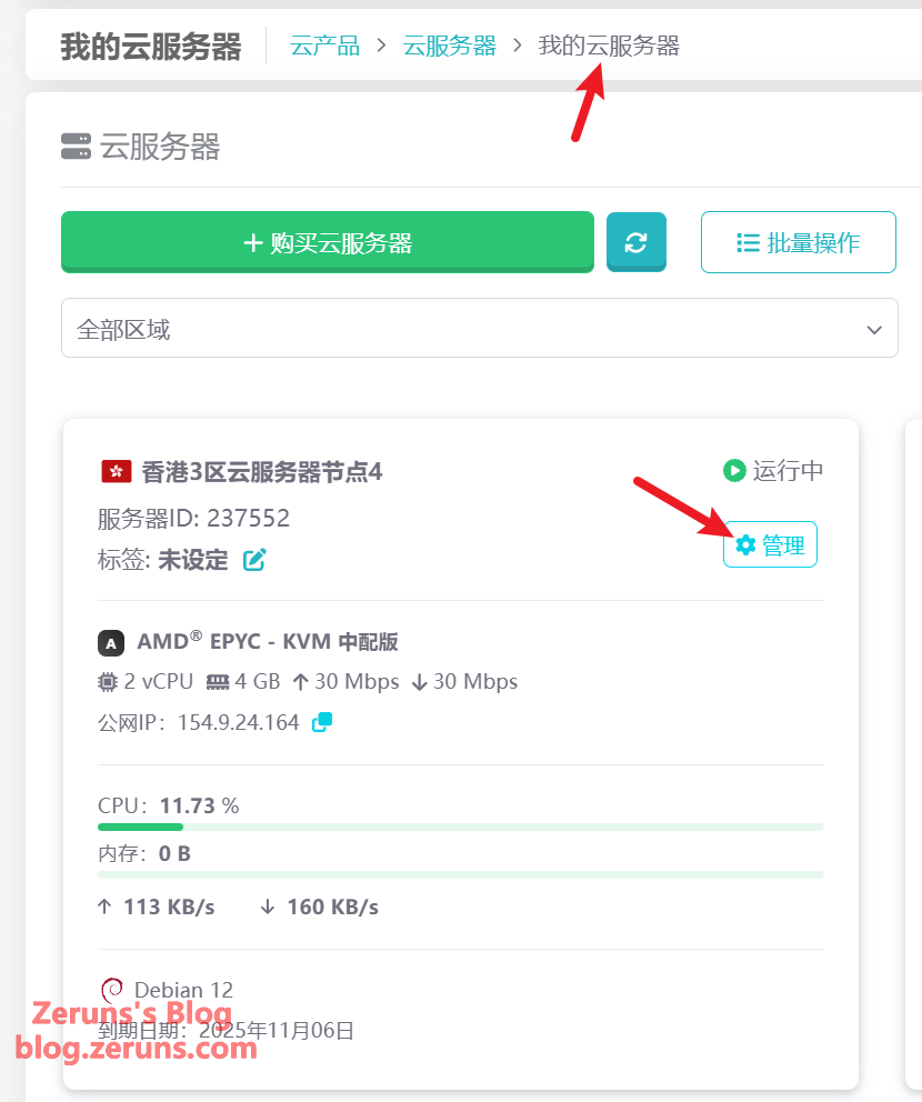 购买后即可在我的云服务器这里看到你买的云服务器,点击管理。