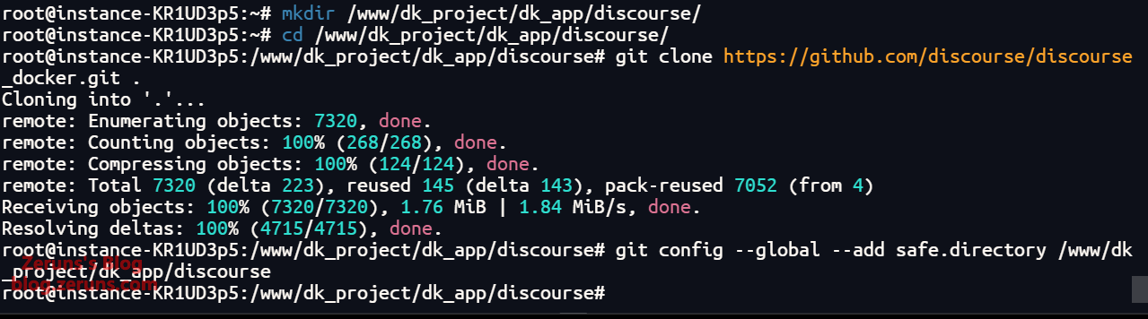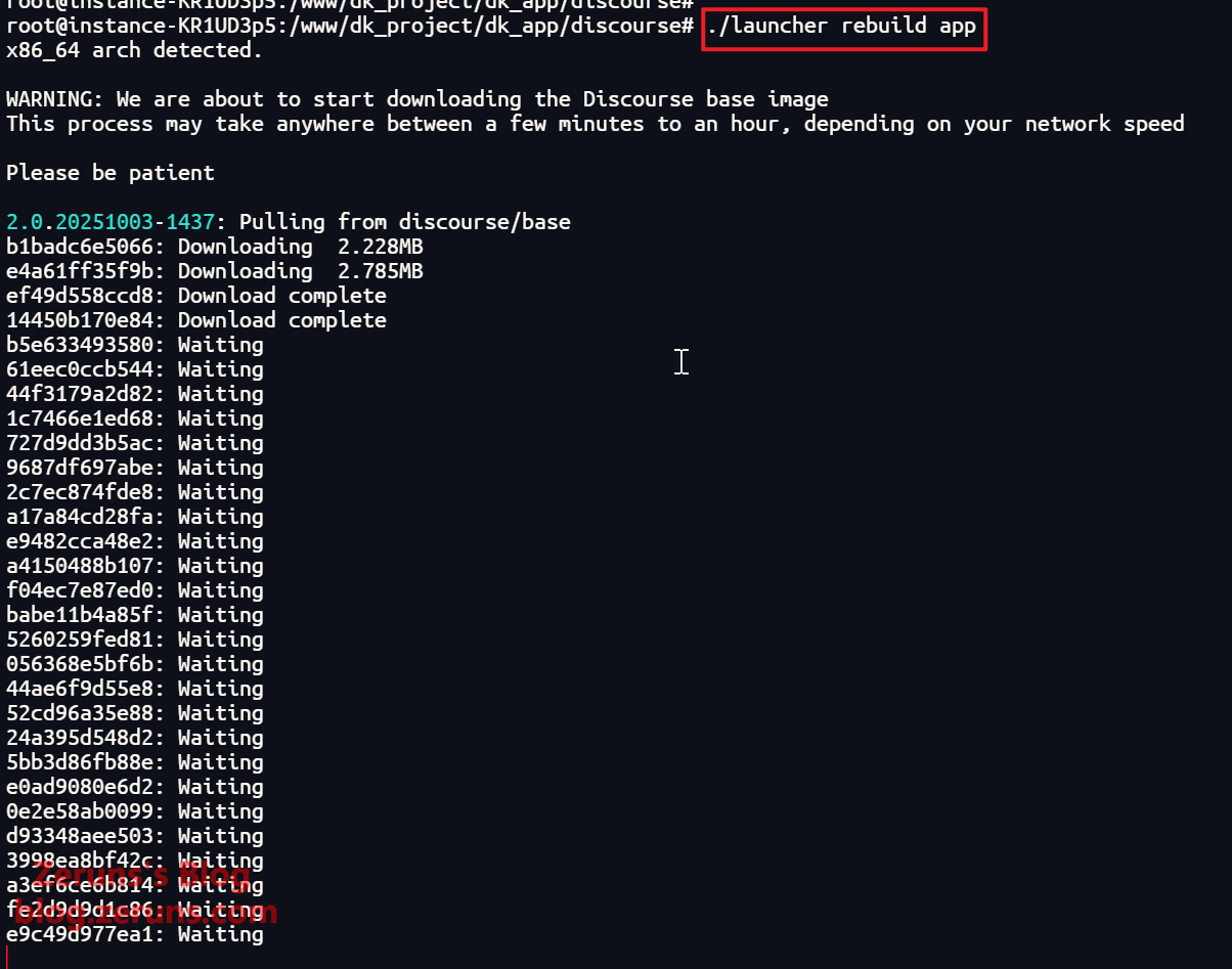 接着执行 cd /www/dk_project/dk_app/discourse 回到安装目录。