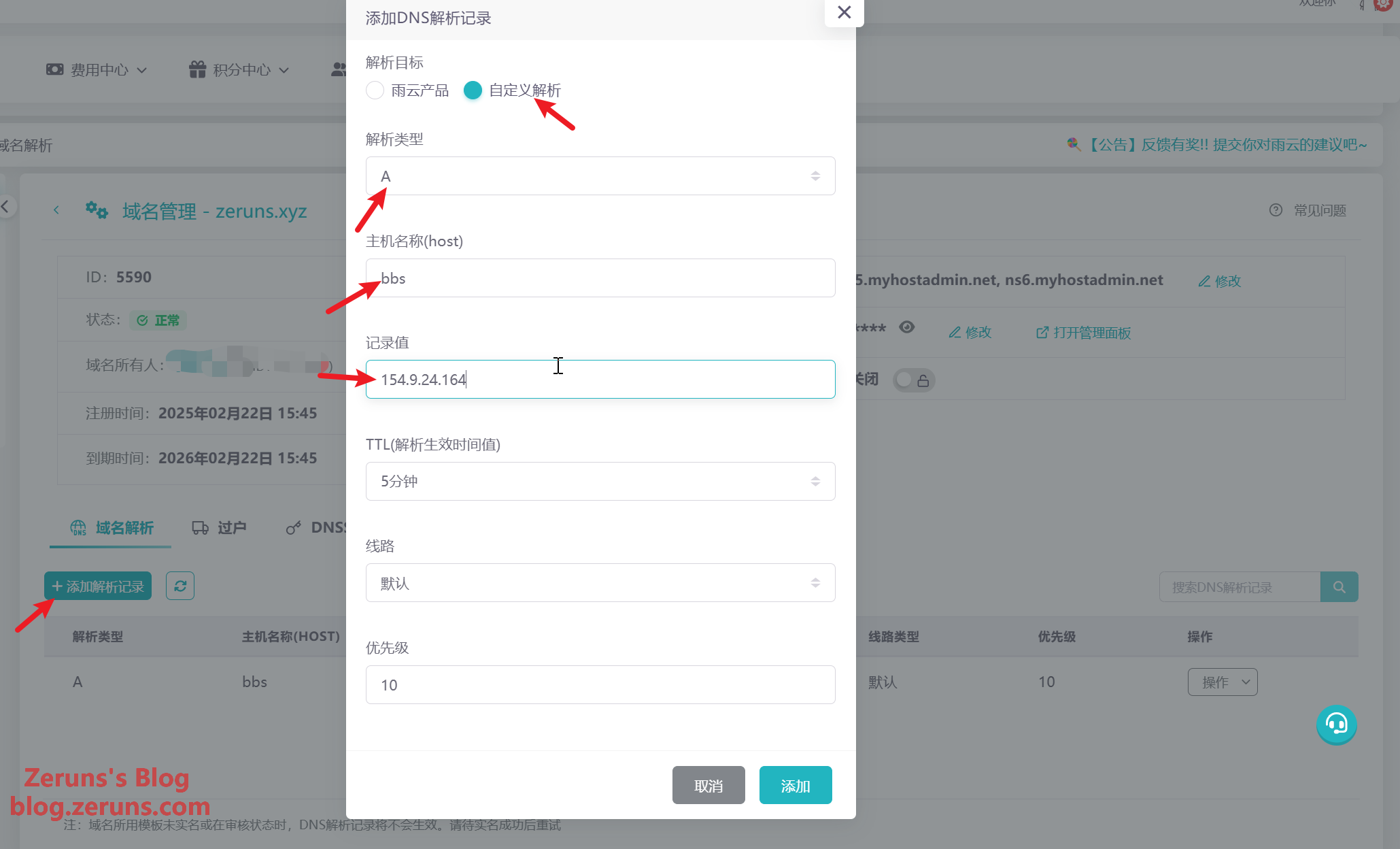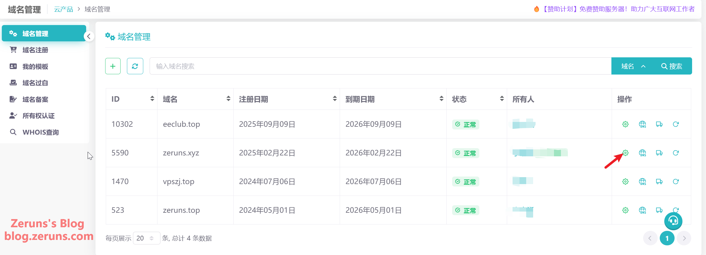 下面以雨云的为例,注册一个zeruns.xyz的域名。