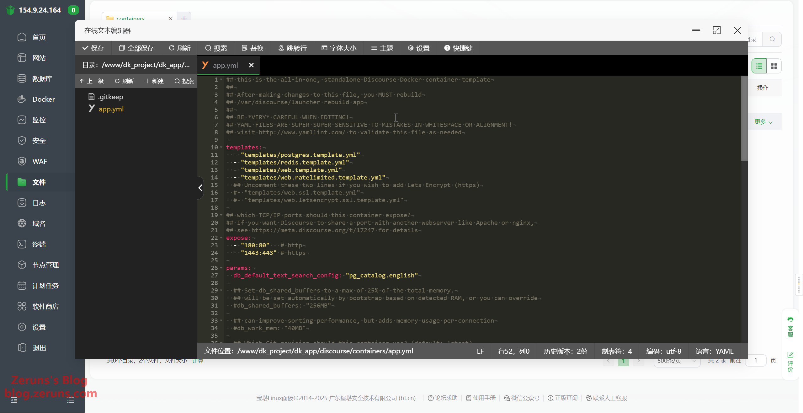guest: /var/log相当于将两个宿主机文件夹映射到运行容器内,使得 Discourse 每次“重建”时不会丢失内容。后续,你也可以用宝塔的文件管理直接去管理这些目录,不用深入 Docker 终端了。