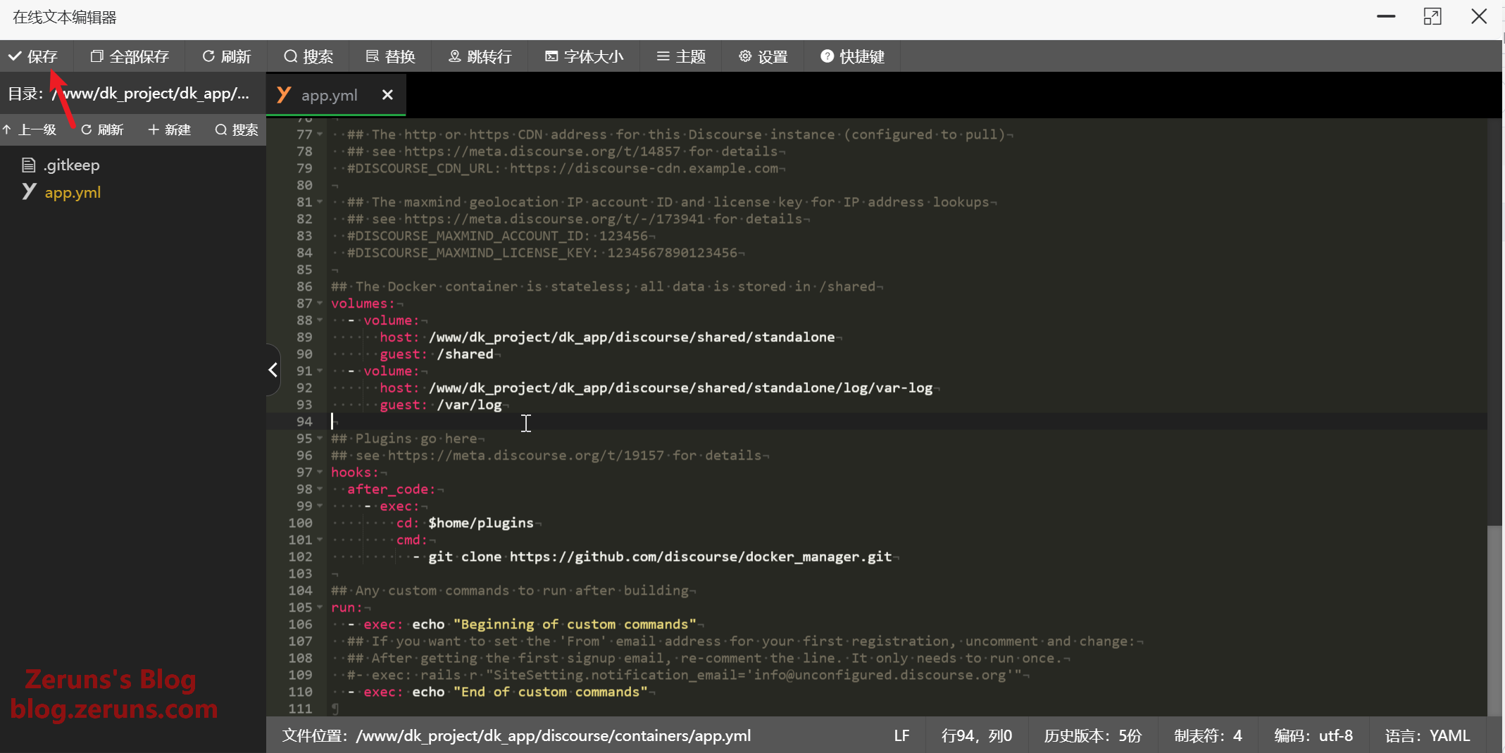 DISCOURSE_HOSTNAME: 'bbs.zeruns.xyz'将单引号里的域名改成你自己的。