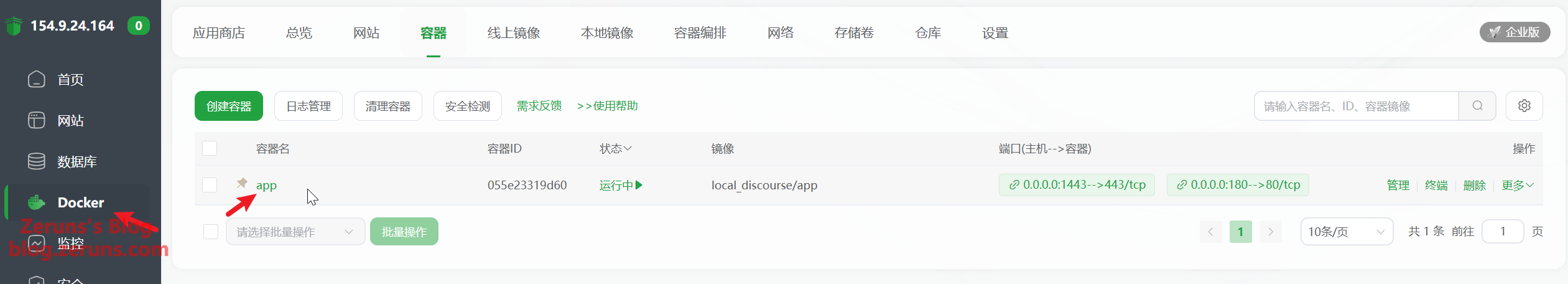 等待安装结束,即可完成安装了。(大概需要十多分钟)如果一切正常,终端将不会弹出任何错误提示,并回到命令行。然后,你将在 宝塔 的“容器”面板里,看到一个已经在运行的容器。(安装过程会有一个临时的容器,要等到容器名为app的容器出来才安装完)