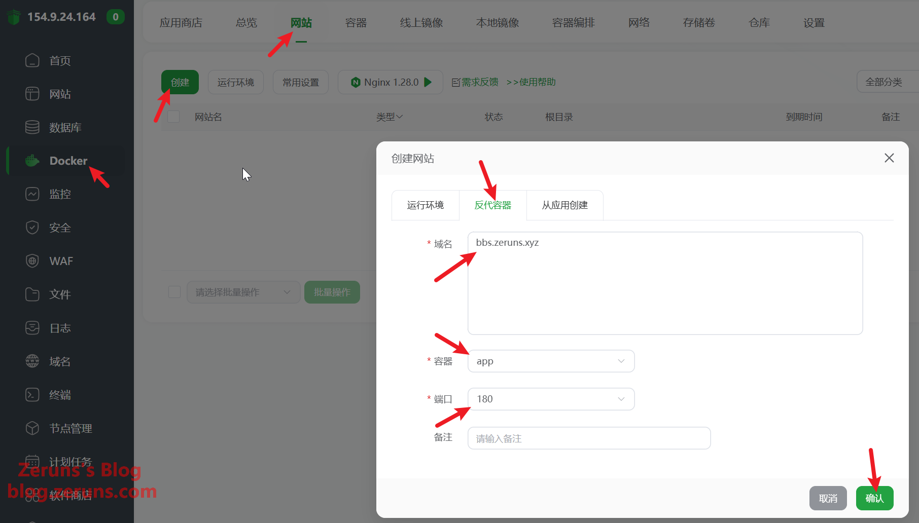 回到宝塔面板,在 Docker→网站→创建→反代容器 里面创建网站。如下图所示,域名输入你自己的域名,容器选app,端口选80端口映射出来的。