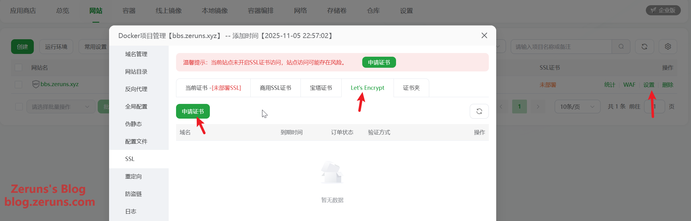 点刚才创建的网站右边的设置,点击SSL→Let's Encrypt→申请证书。