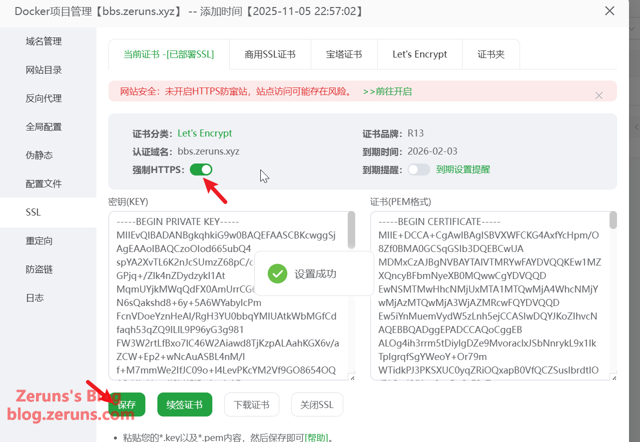 证书申请成功后把强制HTTPS勾选上,然后保存。