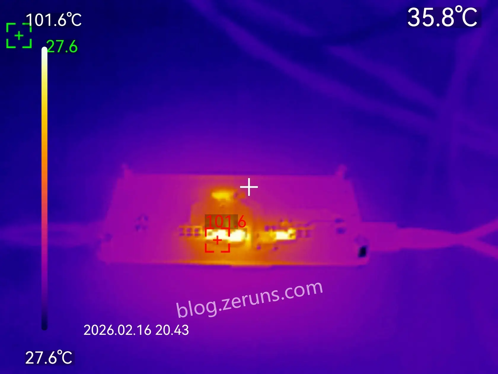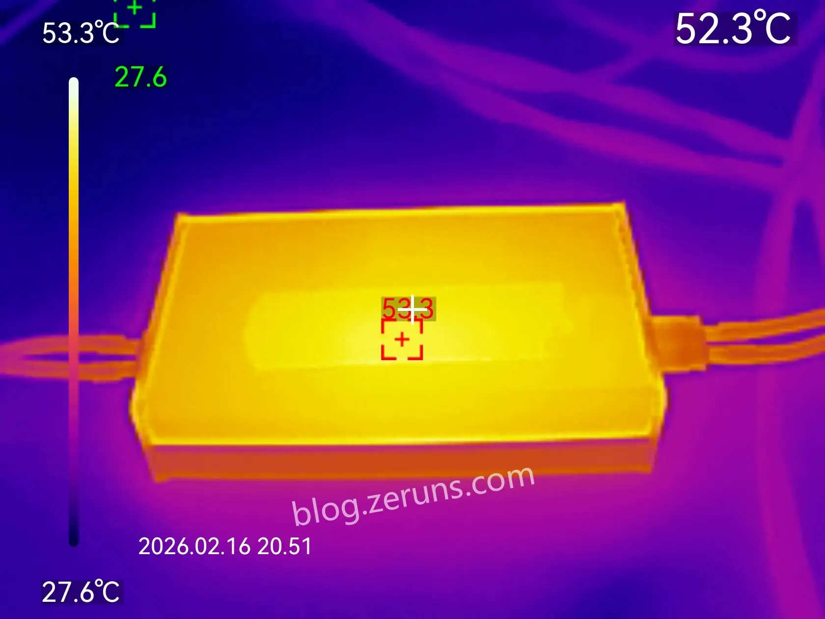 装上铝合金外壳后的热成像图,由于铝合金有点反光,避免影响测量结果所以在中间贴了个胶布,测得MOS管接触的那一面最高温度53℃左右。