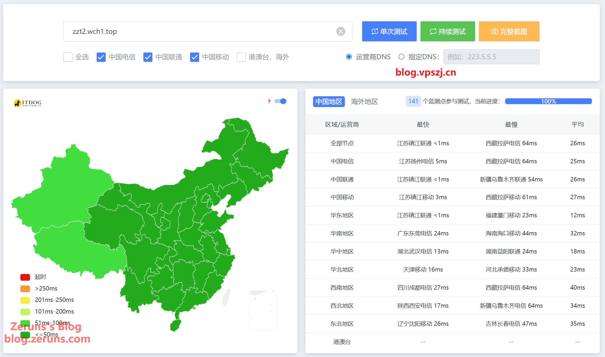 三网平均延迟 26ms,最快江苏镇江联通 1ms。