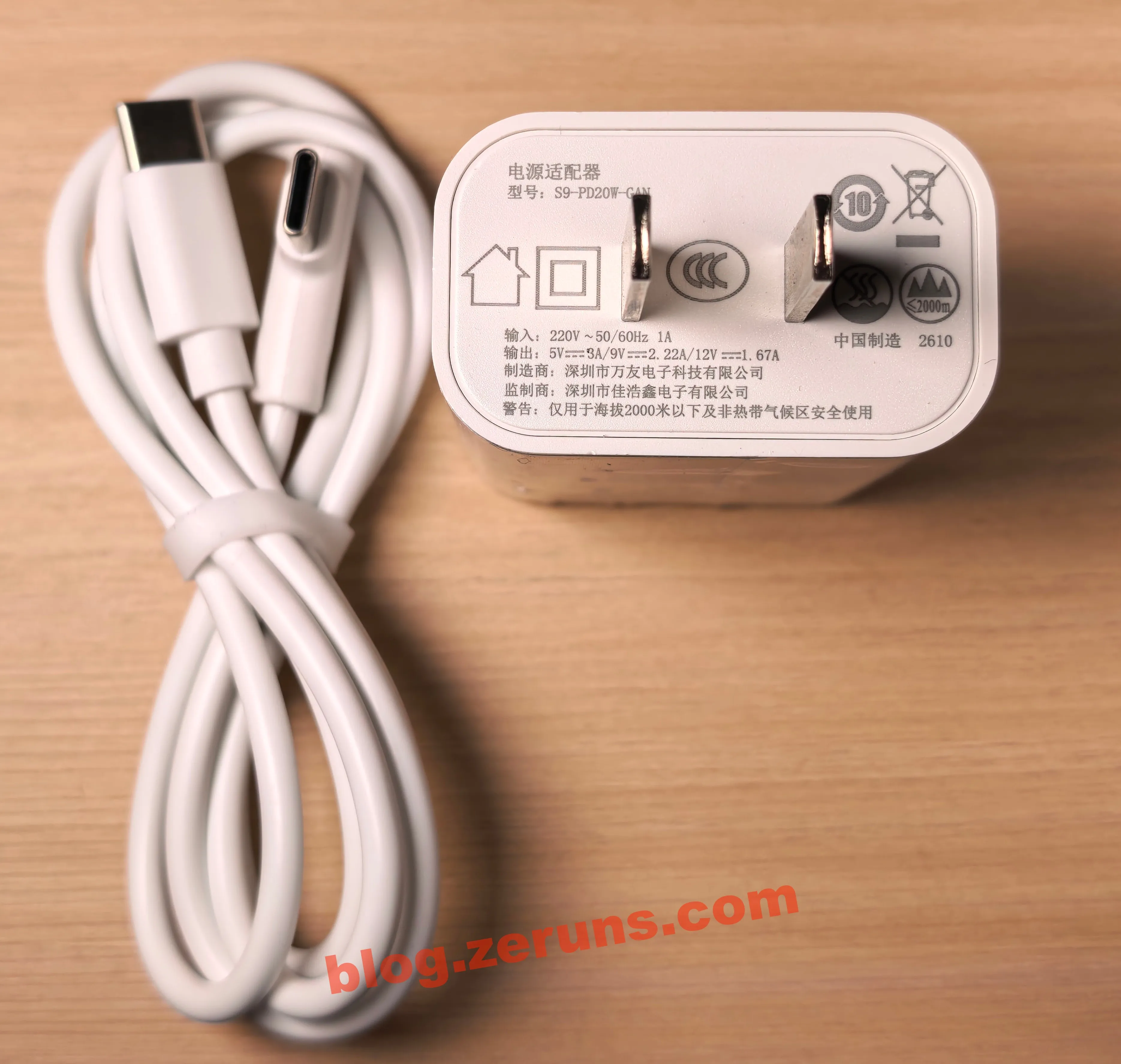 电源线是双Type-C公头的,其中一头是弯插,电源适配器型号是 S9-PD20W-GAN,制造商是深圳市万友电子科技有限公司,监制商是深圳市佳浩鑫电子有限公司,输入220VAC,输出 5V/3A、9V/2.22A、12V/1.67A,从型号看疑似是氮化镓电源,支持PD协议,最高20瓦输出功率。