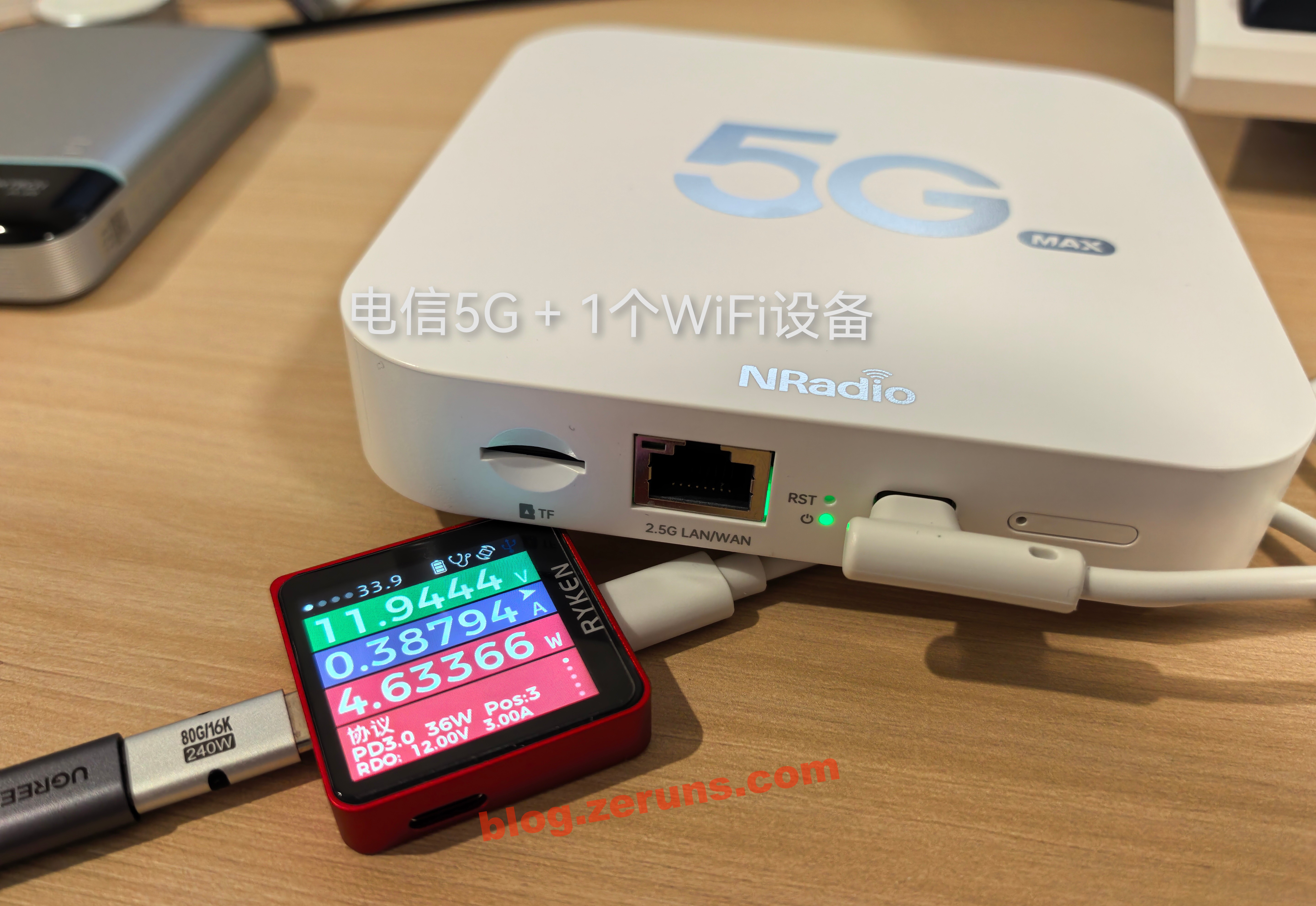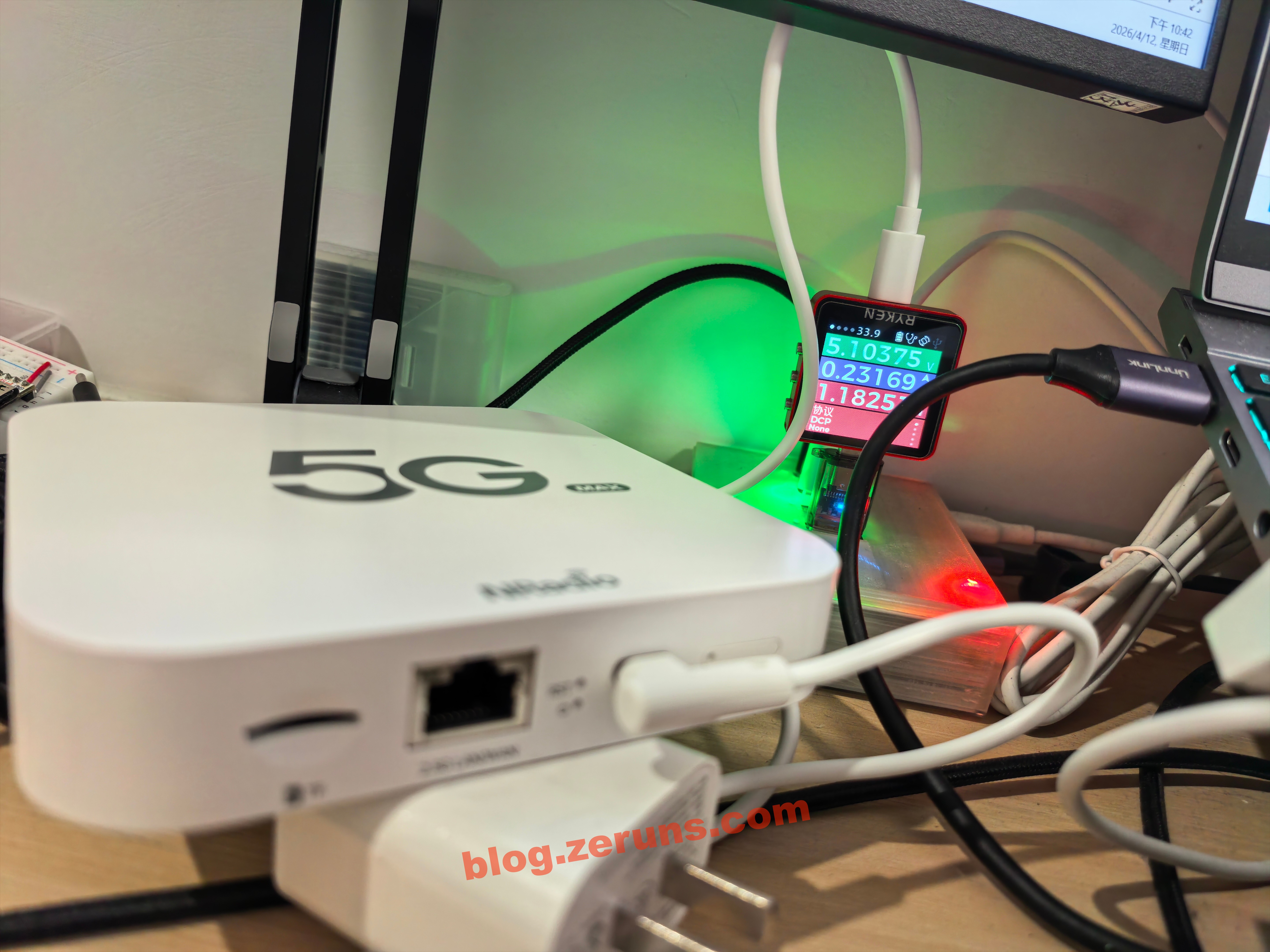 切换电信5G网络,连接一个WiFi设备,不跑数据时功耗在4.6瓦左右。