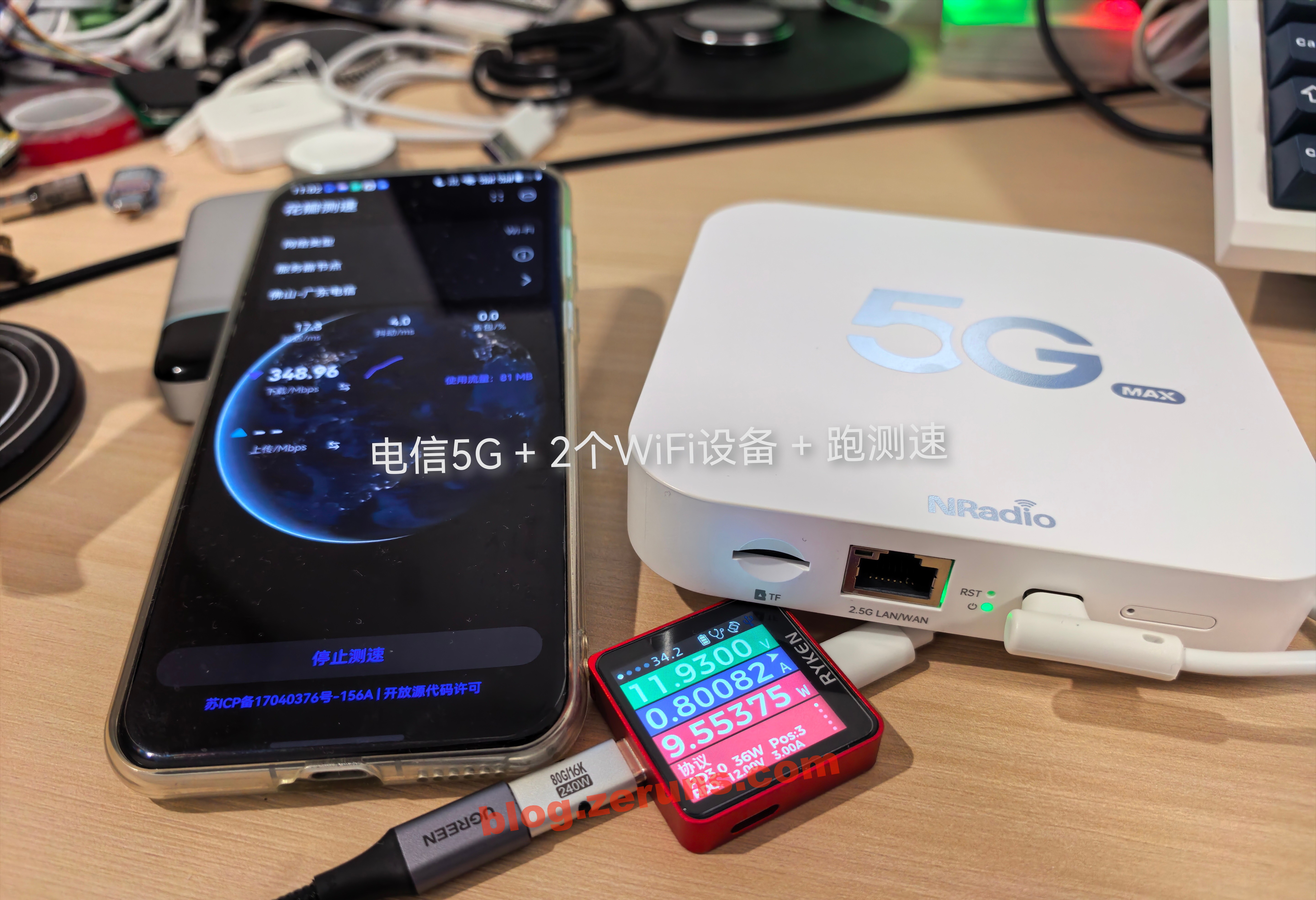 切换电信5G网络,连接2个WiFi设备,跑网络测速时功率9.5W左右。