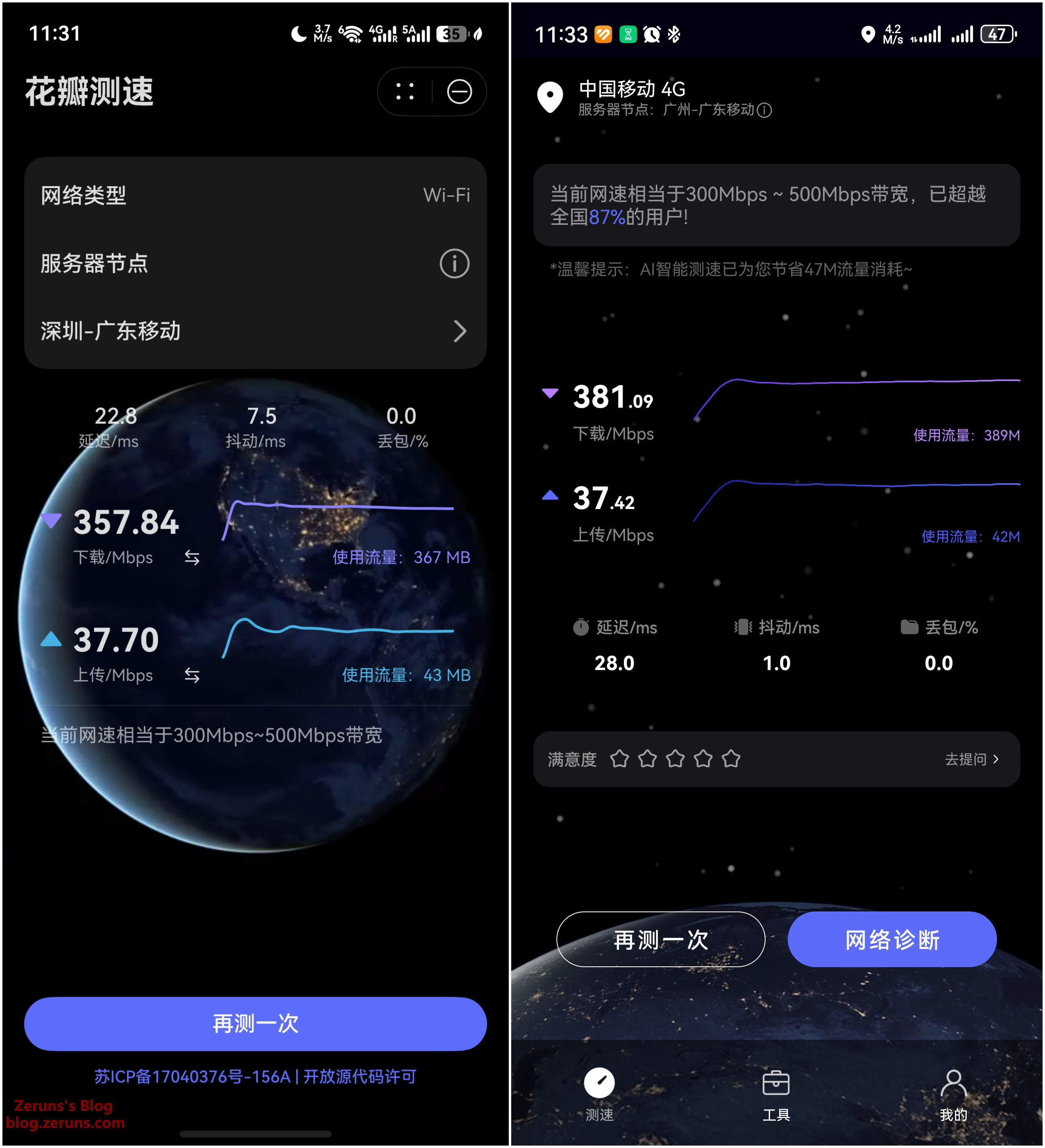 右边是华为Mate70Pro+,下载381.09Mbps,上传37.42Mbps。