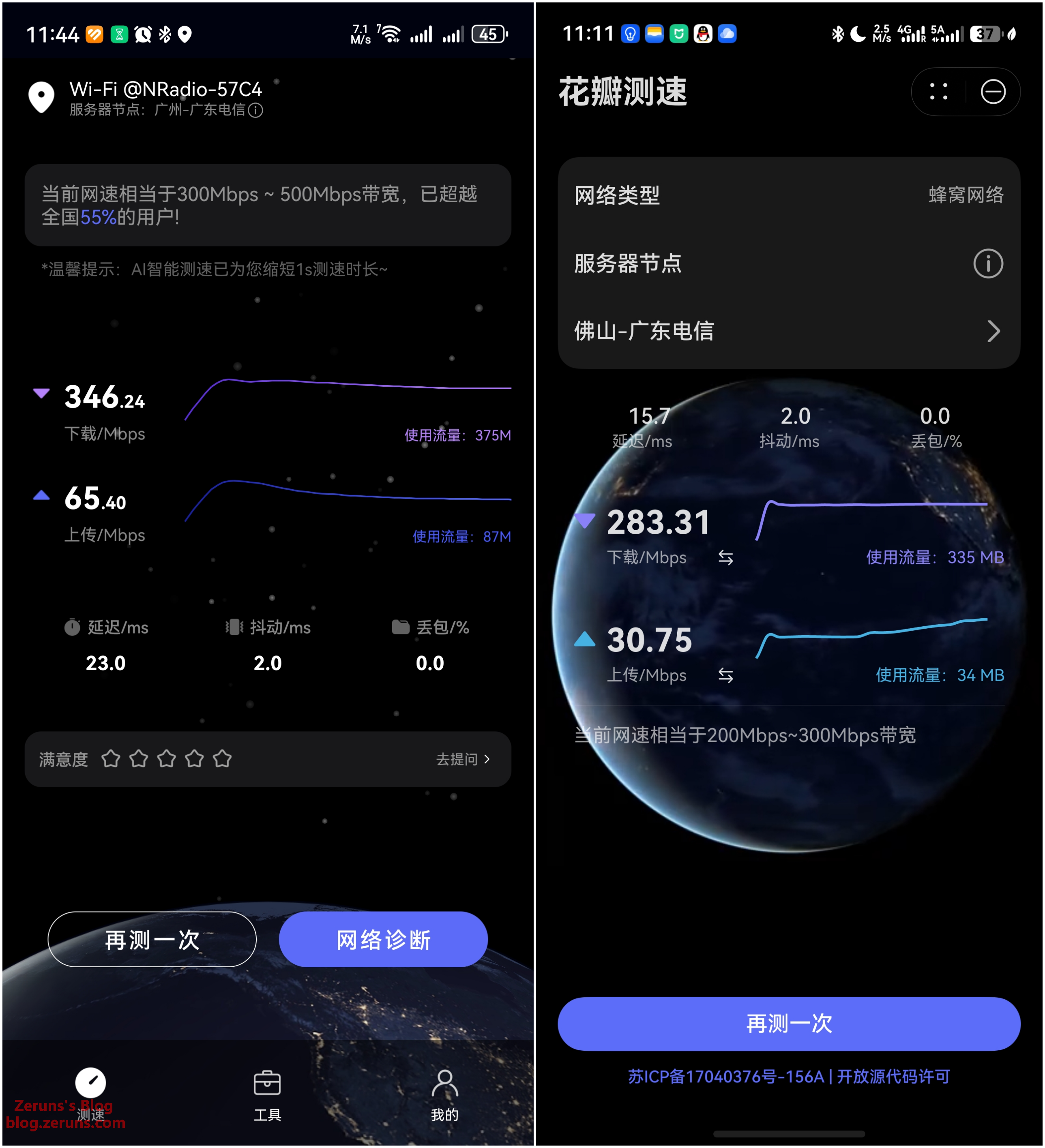 左边是C2000MAX,下载346.24Mbps,上传65.4Mbps;