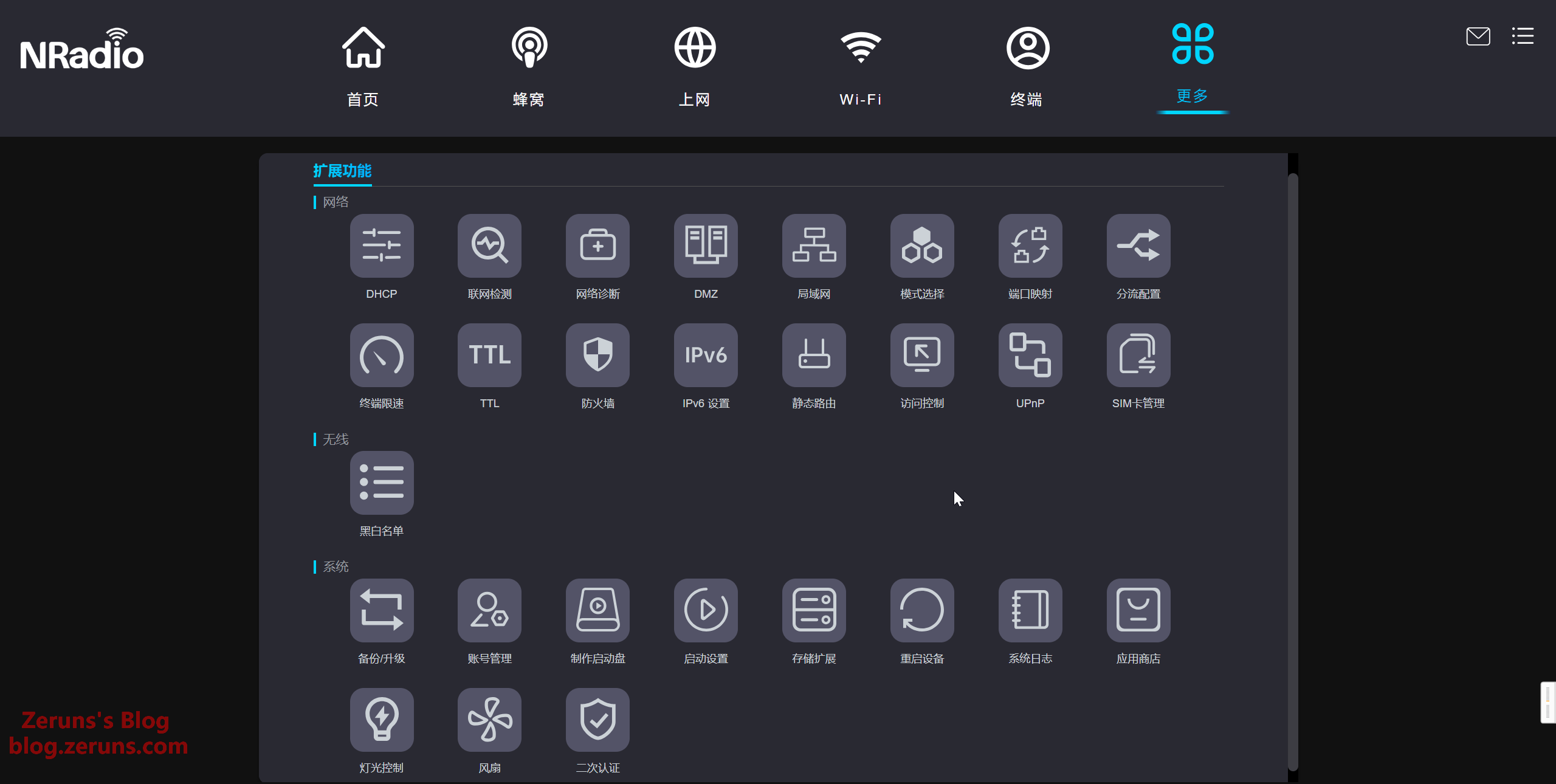 更多设置页里的拓展功能,可开启UPNP、DMZ等,支持IPv6设置,可设置端口映射、终端设备限速等。