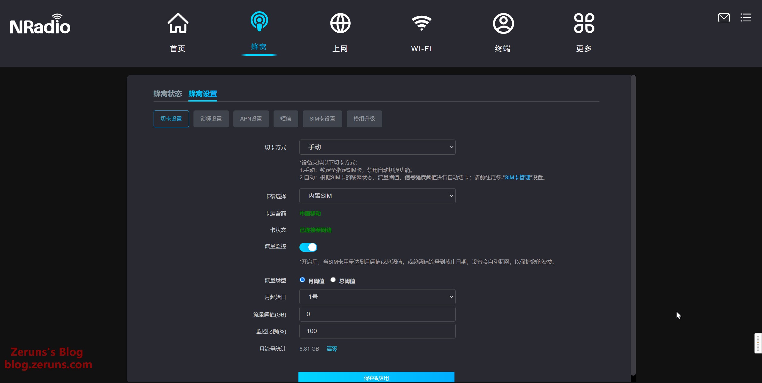 蜂窝设置页,可在这切换SIM卡,也可以改成自动切换(根据流量使用情况切换),可设置流量阈值。