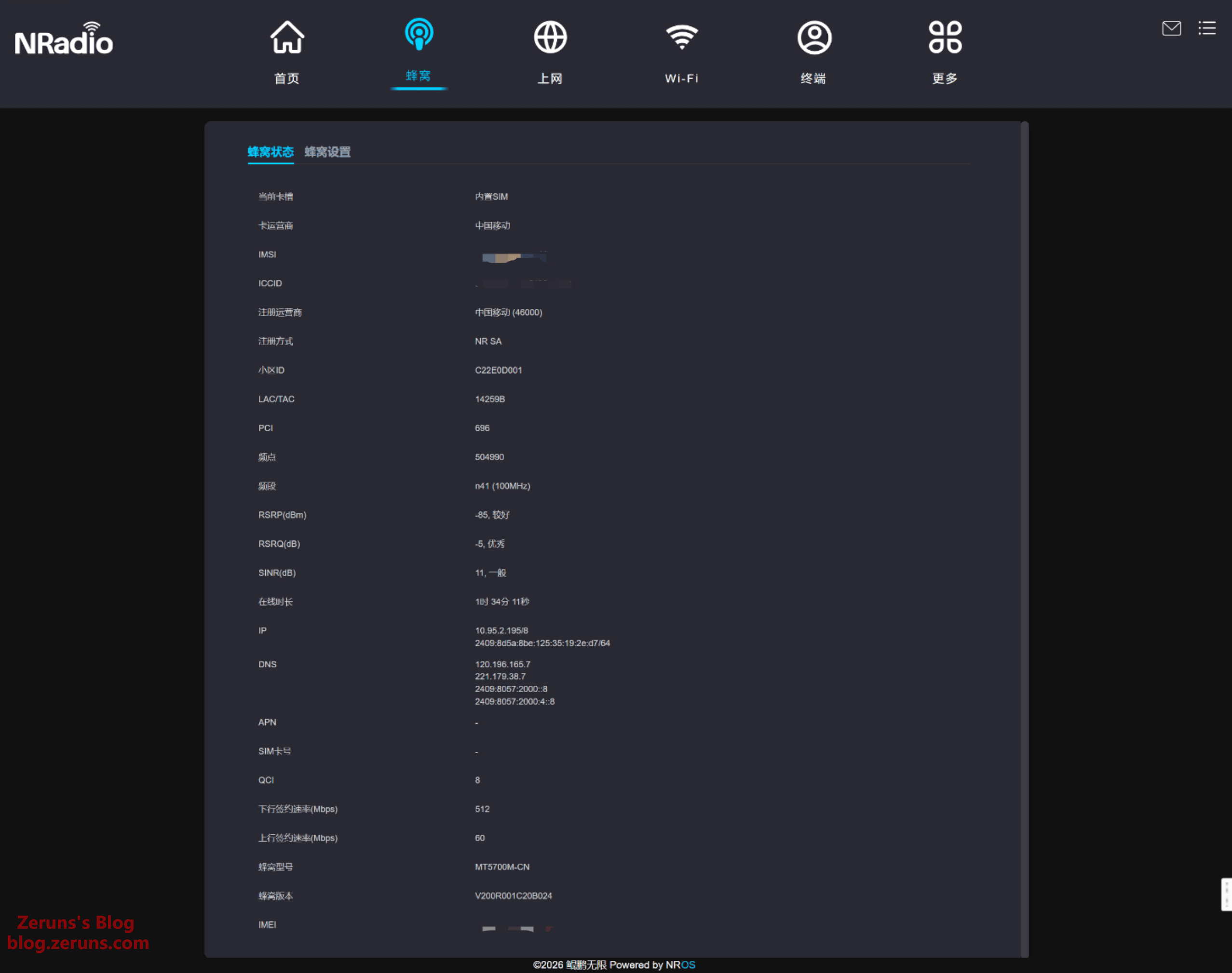 蜂窝状态页,可显示当前蜂窝网络的具体信息(信号强度RSPR、小区ID、网络制式、IP、DNS、运营商、RSRQ、SINR、频点、频段 等等)。