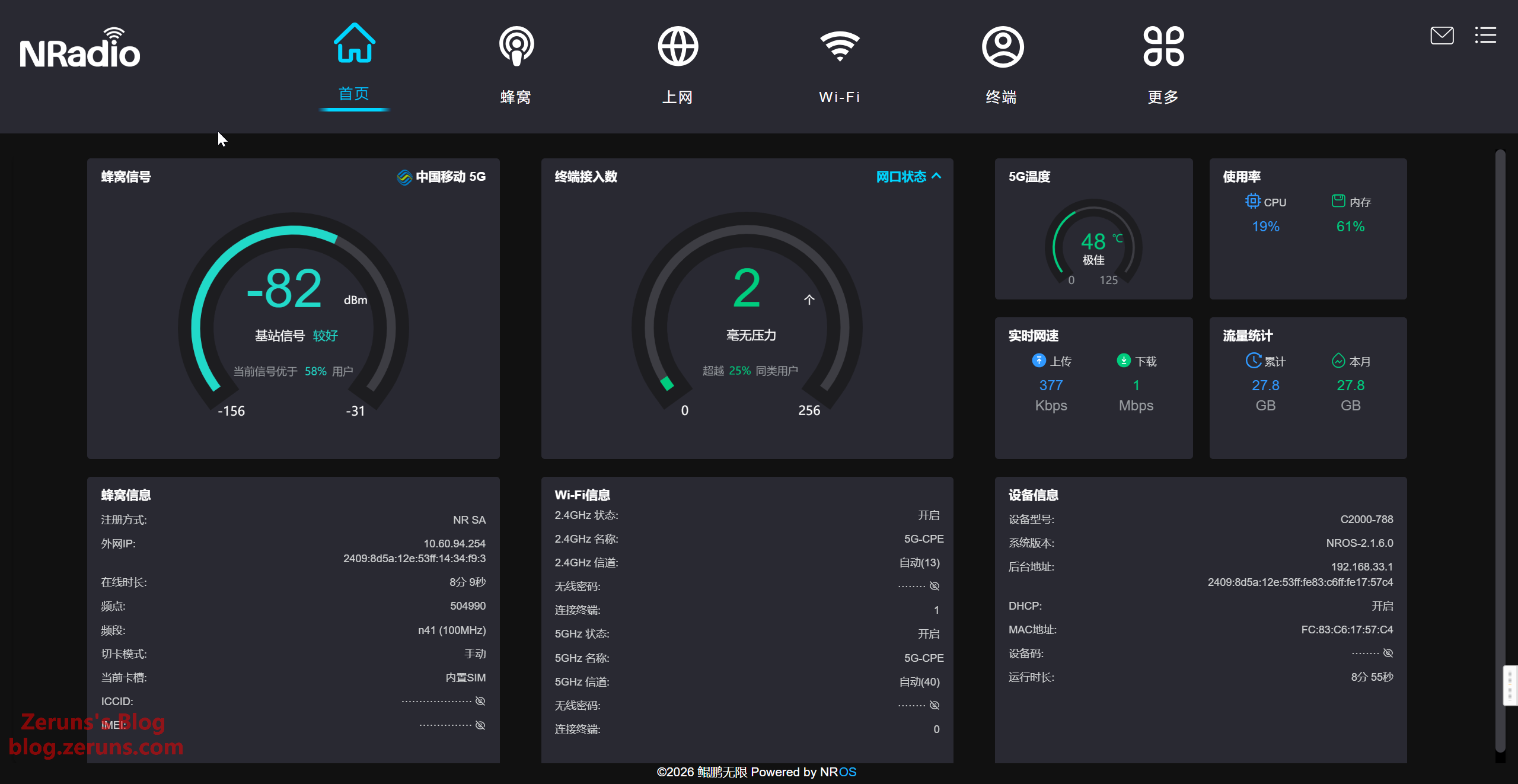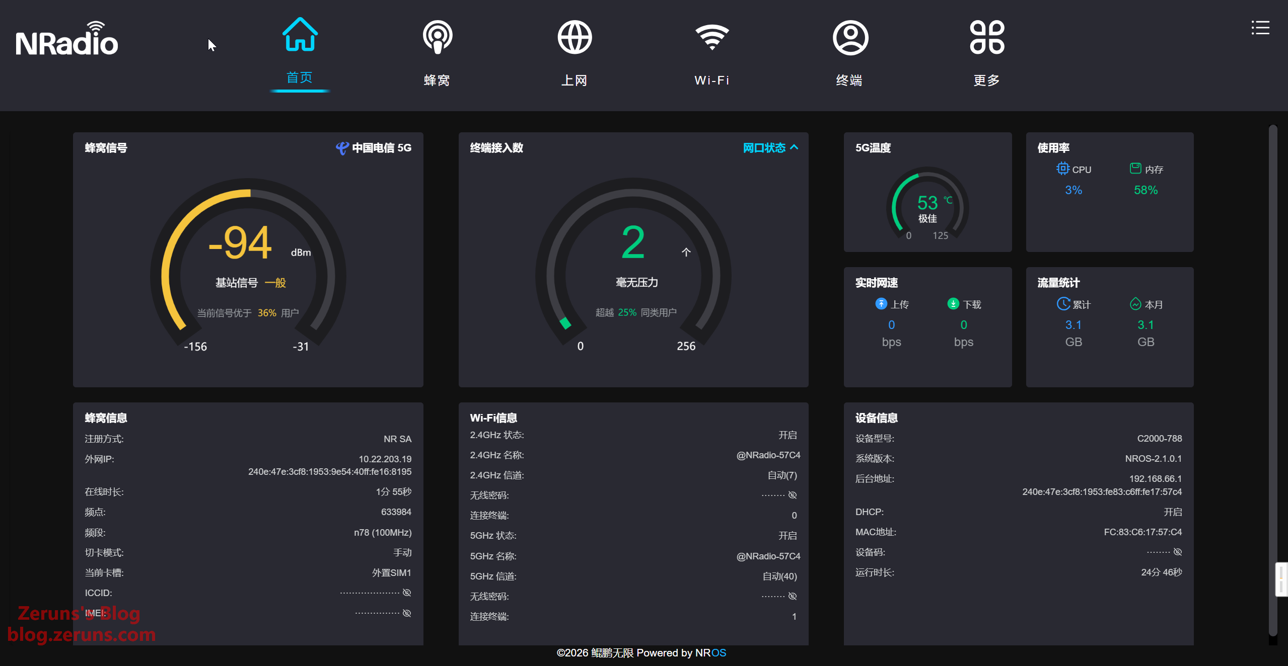 后台首页,显示有设备和网络的基础信息。