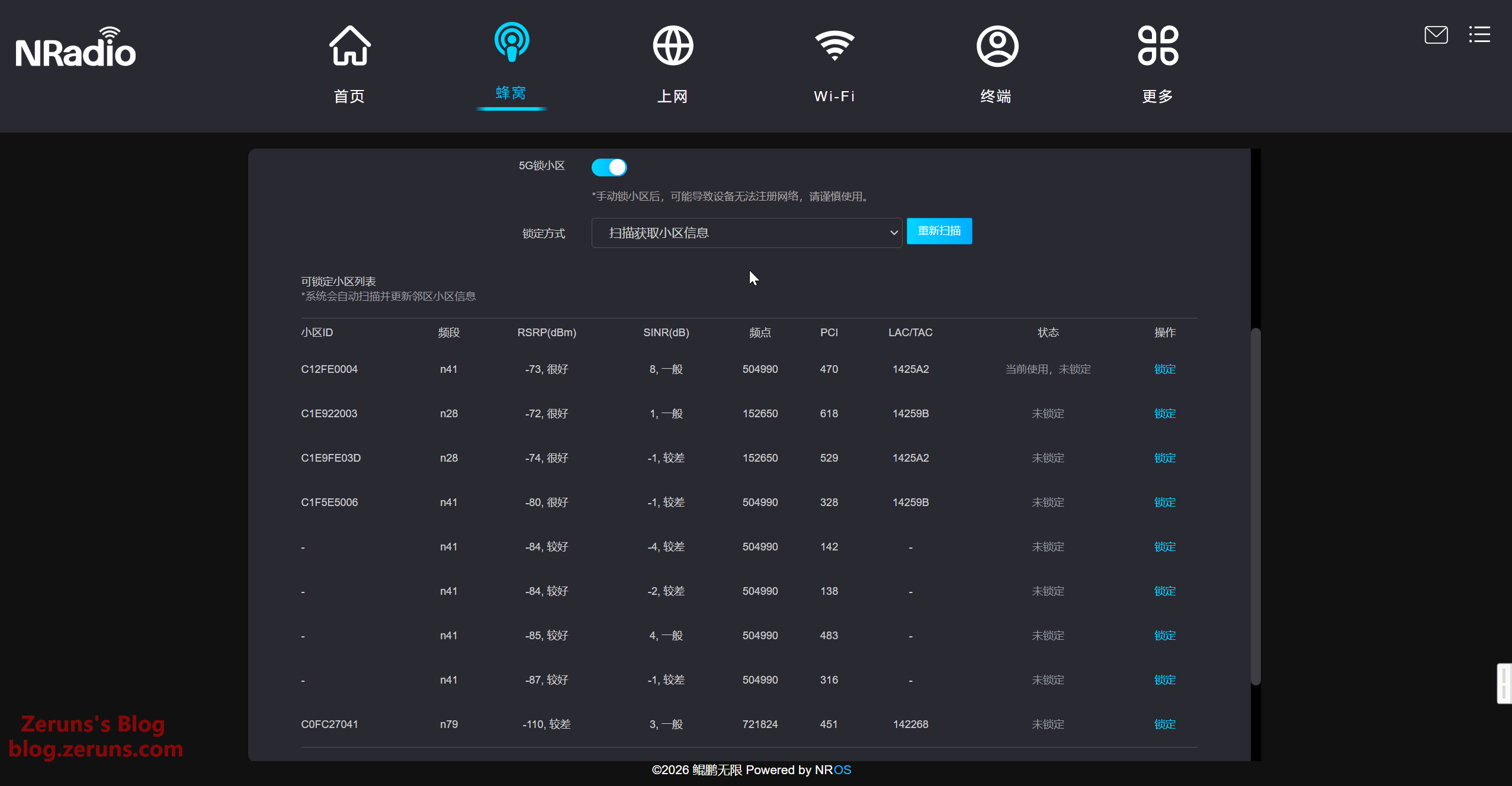 还可以设置锁频和锁小区,锁小区的设置页还可以扫描获取小区信息。